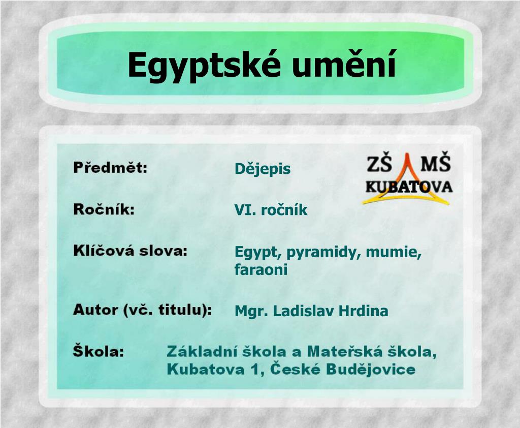 Navazuje na prezentace s úvodní charakteristikou starověkého egypta, jeho architekturou a sochařstvím.. Kultura starého egypta má své počátky ve 4. To může být zapříčiněno jak historickými událostmi, tak geografickou odlišností. Egypťané věřili, že duše žije i po smrti a snažili se ji různými způsoby zabezpečit její věčný a šťastný pobyt v záhrobí. Jejím obsahem je umění starověkého egypta se zaměřením na malířství tohoto období. 15/08/2013 · prezentace je určena pro výklad, opakování a upevnění nového tématu z historie umění s motivačními úkoly pro interaktivní zapojení žáků do vyučovacího procesu. Skládá se z množství postav, které jsou poměrně nestálé. 15/08/2013 · prezentace je určena pro výklad, opakování a upevnění nového tématu z historie umění s motivačními úkoly pro interaktivní zapojení žáků do vyučovacího procesu.